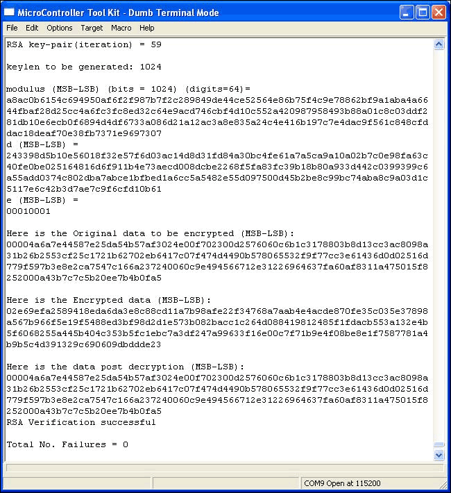 このライブラリは、キーペアの生成およびプライベート/パブリックキーを使用したユーザメッセージの暗号化/復号化を行うための、使いやすいC言語のインターフェイス関数を提供します。これらのインターフェイスのプロトタイプについては、rsalib_1103.hファイルを参照してください。このアプリケーションでは、これらのインターフェイス関数の使い方を示します。