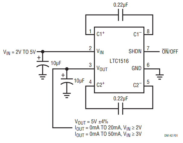 The circuit in Figure 1 produces a regulated 5V output from a 2V to 5V input and consumes only 12μA (typical) of supply current. The LTC1516 is a charge pump DC/DC converter that uses Burst Mode® operation to provide a regulated 5V output.