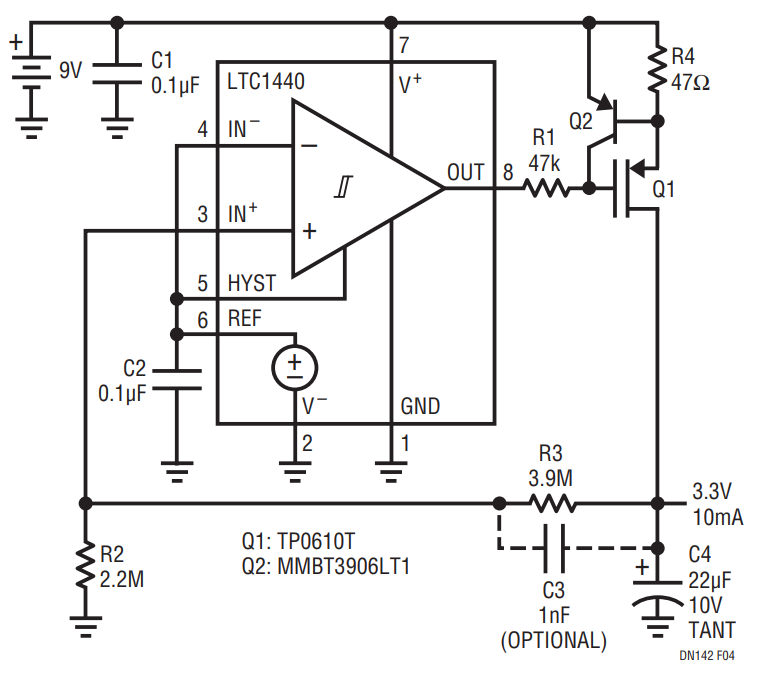 In lightly loaded battery applications that require regulated power supplies, the quiescent current drawn by the DC/DC converter can represent a substantial portion of the average battery current drain. In such applications, minimizing the quiescent current of the DC/DC converter becomes a primary objective because this results in longer battery life and/or an increased power budget for the rest of the circuitry. The following two circuits provide regulated step-up and step-down DC/DC conversion and consume extremely low quiescent current.