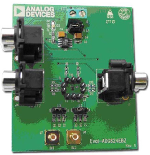 The ADG824 evaluation kit contains a fully fitted PCB and a CD that contains the ADG824 data sheet and the EVAL-ADG824 data sheet. The board is fitted with three audio connectors that allow switching between audio devices. All signals applied to the switch can be monitored using the test points provided on the board.