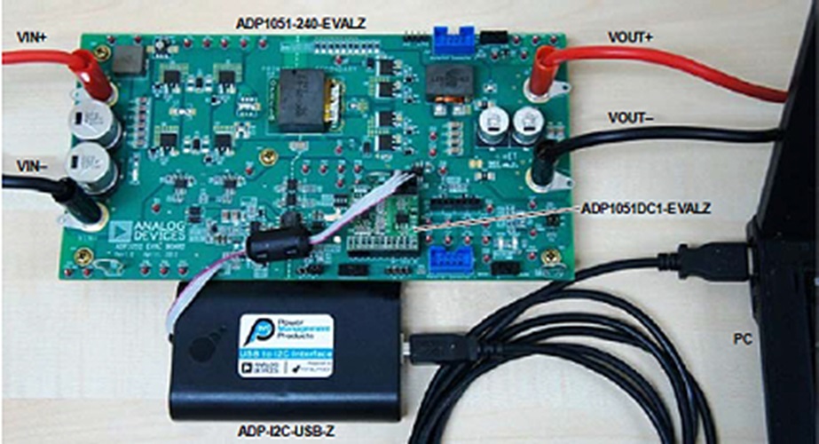 The ADP1051-240-EVALZ evaluation board, together with an ADP1050DC1-EVALZ daughter card, allows the user to evaluate the ADP1050 in a power supply unit (PSU) environ-ment. The boards are fully compatible with the ADP1050-51 GUI software. With the ADP-I2C-USB-Z USB-to-I2C connector and the GUI software, the ADP1050 on the evaluation board can be interfaced with a PC via a USB port.The evaluation board allows the ADP1050 to be exercised without the need for external components. The board is set up to act as an isolated PSU, outputting a rated load of 12 V, 20 A from a 36 V dc to 75 V dc source.