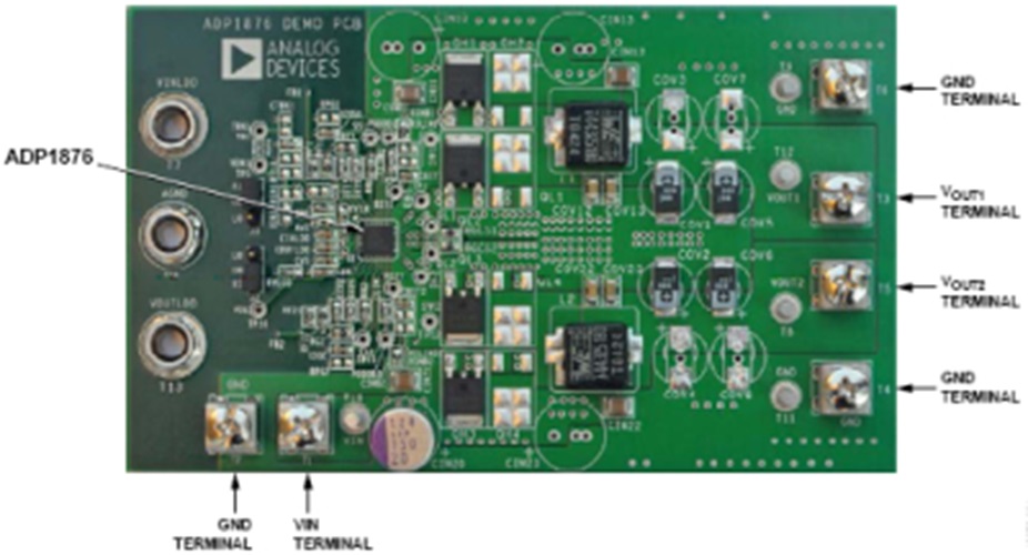 The ADP1876 is a dual-channel, step-down switching controller with integrated drivers for external N-channel synchronous power MOSFETs. The two PWM outputs are phase shifted 180°, which reduces the input rms ripple current, thus minimizing the required input capacitance.In addition, boost diodes are integrated into the ADP1876, which lowers the overall system cost and component count. The ADP1876 is configured to operate in forced PWM continuous conduction mode.