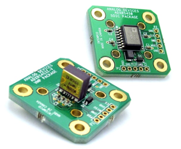 The EVAL-ADXRS453Z is a simple breakout board that enables easy connection of an ADXRS450 into an existing system. The ADXRS450 is a digital-output, single-axis gyroscope with built-in temperature calibration.The ADXRS453 is available in two packages: an SOIC package for yaw-axis rate sensing, and a vertical-mount package (VMP) for pitch- or roll-axis sensing. In applications requiring multi-axis sensing, the innovative VMP greatly simplifies assembly by eliminating the need for additional boards mounted at 90°. Breakout boards are available for the ADXRS450 in both packages, as listed in the Ordering Guide below.