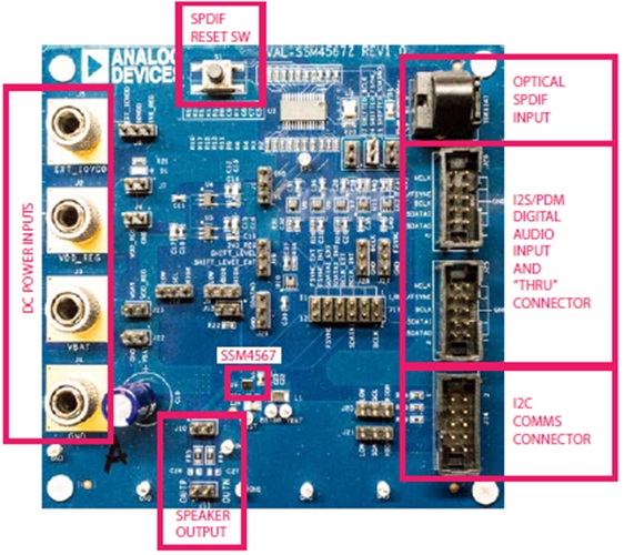 The SSM4567 evaluation board is a complete solution for driving loudspeakers with boosted battery power supply as well as sense output current, output voltage and the VBAT supply voltage. It includes the SSM4567 amplifier IC and the additional components needed to connect digital audio using an I2S/TDM interface or an SPDIF optical interface.