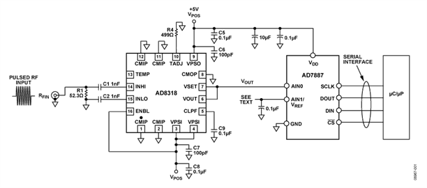 AD7887は、SPIインターフェースを備えた2チャンネルの12ビットADCです。このデバイスの第2の入力チャンネルを用いてAD8318のTEMPピンに接続できます。このように接続すると、AD8318の周囲温度を計測することができます。AD8318の電力測定出力と同様に、TEMP電圧出力もキャリブレート(校正)する必要があります