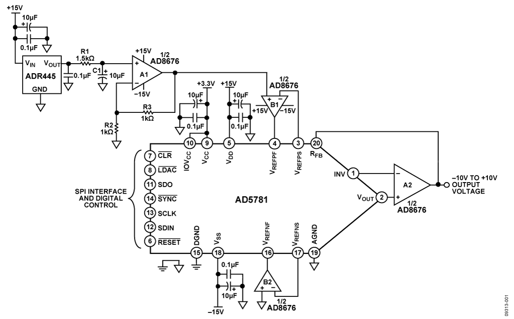 The digital input to the circuit is serial and is compatible with standard SPI, QSPI, MICROWIRE®, and DSP interface standards. For high accuracy applications, the circuit offers high precision, as well as low noise—this is ensured by the combination of the AD5781, ADR445 and AD8676 precision components.