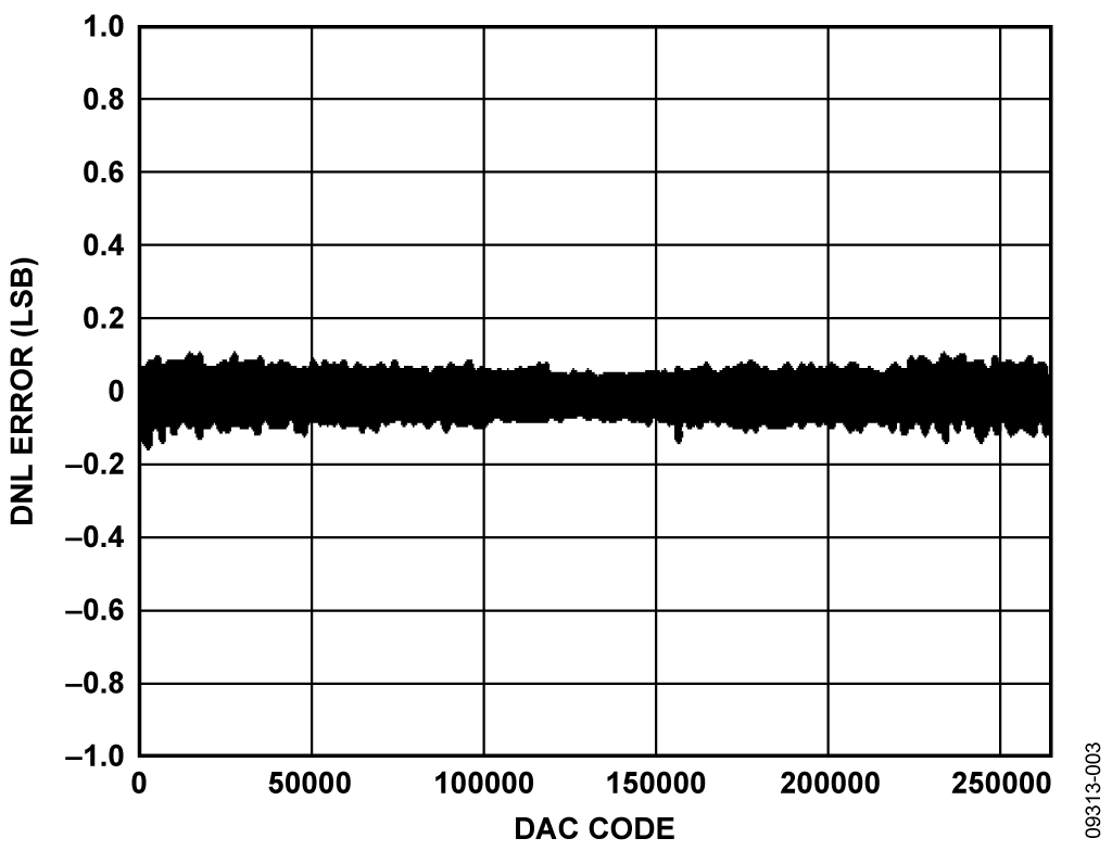 The precision performance of the circuit shown in Figure 1 is demonstrated in the data in Figure 2 and Figure 3, which show integral nonlinearity and differential nonlinearity as a function of DAC code. As can be seen, both are significantly within the specifications of ±0.5 LSB and ±0.5 LSB, respectively.