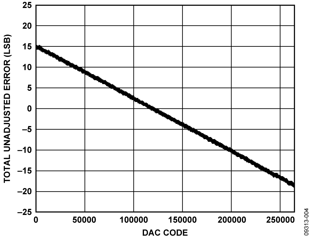 The total unadjusted error for the circuit consists of the dc errors combined together—that is, INL error, offset error, and gain error. Figure 4 shows a plot of total unadjusted error as a function of DAC code. The maximum errors occur at DAC code zero and DAC code 262,143. This is expected, and due to the absolute error in the voltage reference output, the mismatch in external resistors R2 and R3 (see Figure 1), and the mismatch in the AD5781 internal resistors RFB and R1 (see Figure 5).