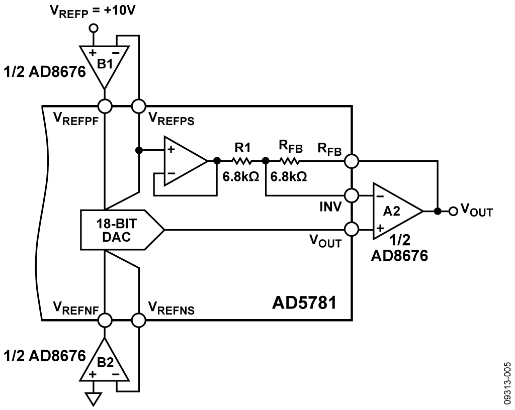 The digital-to-analog converter (DAC) shown in Figure 1 is the AD5781, a high voltage, 18-bit converter with SPI interface, offering ±0.5 LSB INL, ±0.5 LSB DNL, and 7.5 nV/√Hz noise spectral density. The AD5781 also exhibits an extremely low temperature drift of 0.05 ppm/°C. The precision architecture of the AD5781 requires force-sense buffering of its voltage reference inputs to ensure specified linearity. The amplifiers (B1 and B2) chosen to buffer the reference inputs should have low noise, low temperature drift, and low input bias currents. The recommended amplifier for this function is the AD8676, an ultraprecision, 36 V, 2.8 nV/√Hz, dual op amp exhibiting low offset drift of 0.6 μV/°C and input bias currents of 2 nA. In addition, the AD5781 is characterized and factory calibrated using this dual op amp to buffer its voltage reference inputs, further enhancing confidence in partnering the components.
