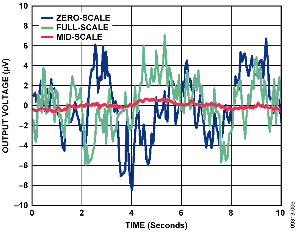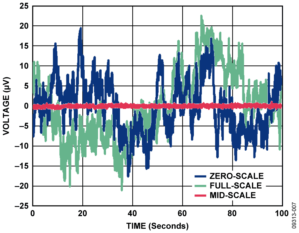 A real application, however, will not have a high-pass cutoff at 0.1 Hz to attenuate 1/f noise, but will include frequencies down to dc in its pass band; therefore, the measured peak-to-peak noise will be more realistically shown in Figure 7. In this case, the noise at the output of the circuit was measured over a period of 100 seconds, effectively including frequencies as low as 0.01 Hz in the measurement. The upper frequency cutoff is at approximately 14 Hz and is limited by the measurement setup. For the three conditions shown in Figure 7, the peak-to-peak values are 1.61 μV for mid-scale output, 43.33 μV for full-scale output, and 36.89 μV for zero-scale output. The worst-case peak-to-peak value of 43.33 μV corresponds to approximately ½ LSB.