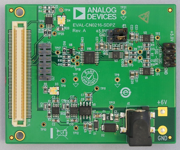 この回路は回路基板EVAL-CN0216-SDPZとシステム・デモ用プラットホーム(SDP) 評価基板EVAL-SDP-CB1Zを使用します。2つの基板には、回路の性能の迅速な設定と評価を可能にする120ピンコネクタが付いています。基板EVAL-CN0216-SDPZは(このノートに記述されているように)評価対象の回路を含みます。そして回路基板EVAL-CN0216-SDPZからのデータを取り込むためにSDP評価基板をCN-0216評価ソフトウエアと共に使用します。