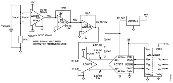 ゲインが–10の2つの反転ゲイン段をカスケード接続することにより、AD629の100mVのフルスケール出力が100倍に増幅されて10Vのフルスケール信号になります。これらは電流の方向に応じて正と負のいずれの値にもなり得ます。