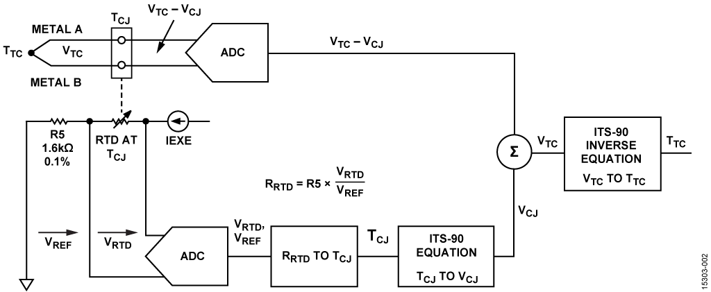ソフトウェアは次に、熱電対の合計電圧(VTC− VCJ)に冷接点の電圧(VCJ)を加えて、熱電対の EMF(起電力)(VTC)を求めます。