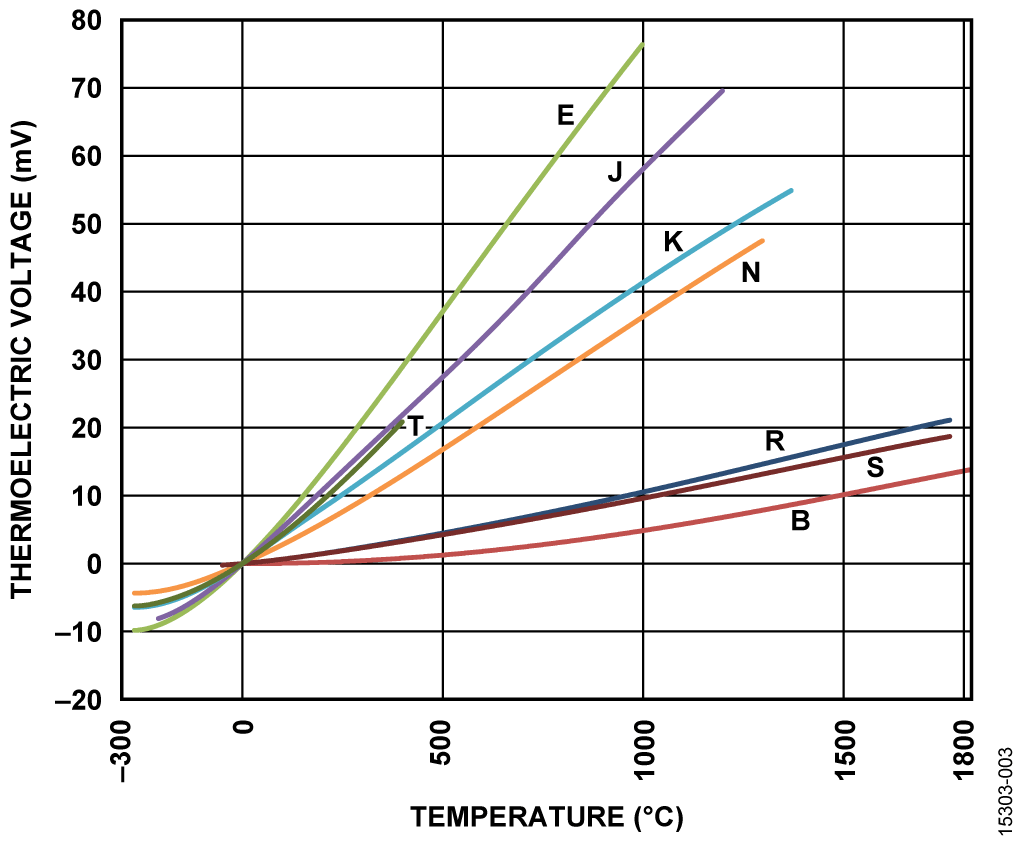 図 3 に示すように、それぞれの熱電対は範囲と感度が異なります。例えば、タイプ J の熱電対は鉄とコンスタンタンを接合したもので、範囲はおおよそ −210 ℃ ~ +1200 ℃、感度は 55 µV/℃ です。
