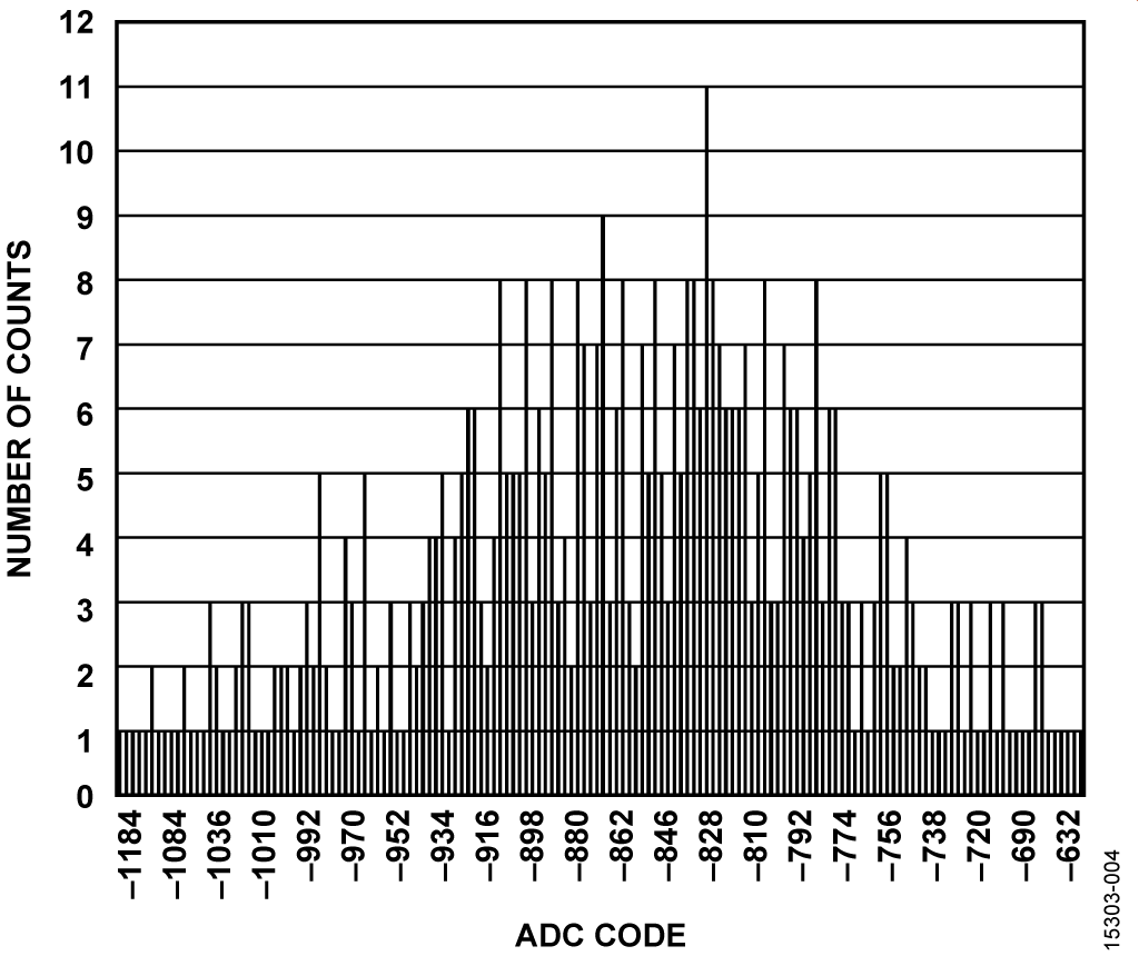 ヒストグラムから、入力を基準にしたピーク to ピークは 2.51 µV になります。125 mV のフルスケール入力では、ノイズ・フリー・コード分解能は次式で計算できます。