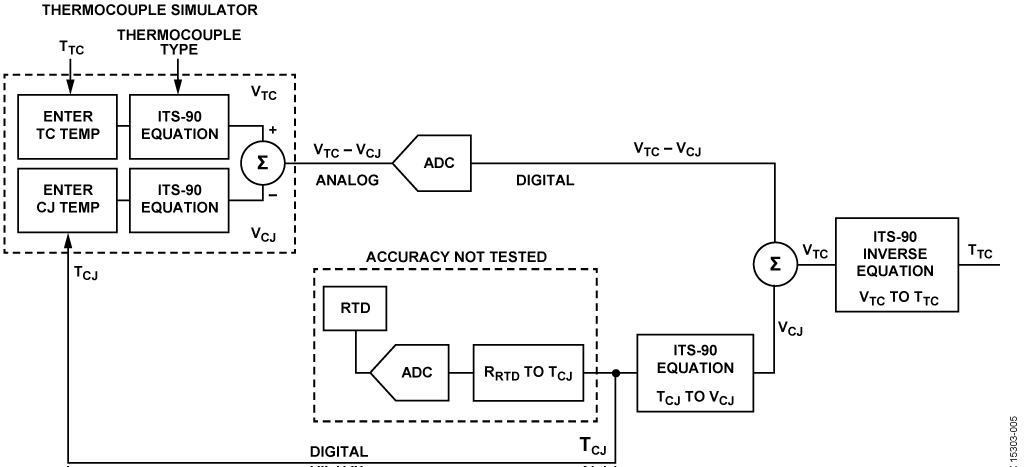 このシミュレータには、熱電対のタイプと温度、および冷接点の温度を入力することができます。次に、シミュレータは ITS-90 の表と式を使って、熱電対の温度(TTC)と冷接点の温度(TCJ)をそれぞれの電圧 VTC と VCJ に変換します。次に、 VCJ を VTC から差し引いて、シミュレータの出力電圧 VTC – VCJ が得られます。