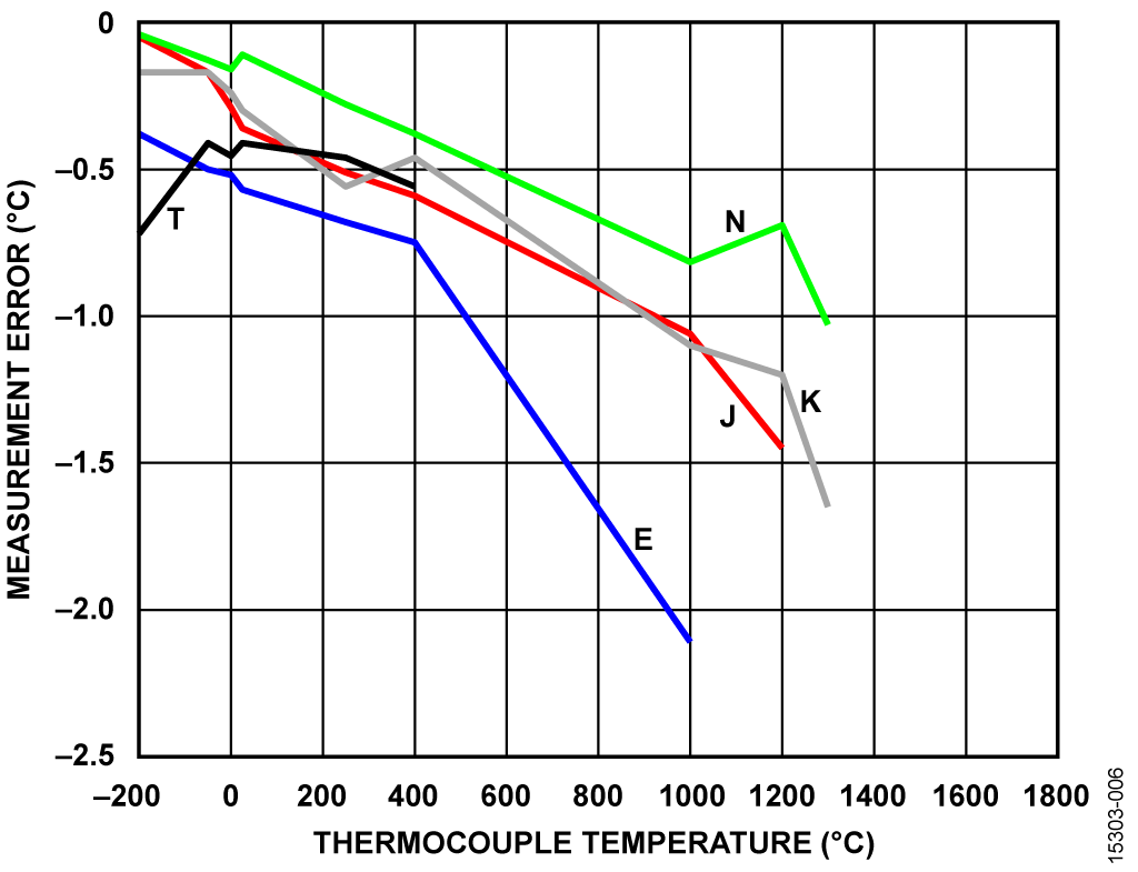 冷接点の温度範囲は 0 ℃ ~ 50 ℃ で、最大と最小の出力電圧範囲は、各種タイプの電圧振幅を調査し、熱電対の電圧から差し引かれる冷接点の電圧成分を含めることによって決まります。表 1 に示すように、タイプ E の熱電対は最も広い範囲を必要とします。