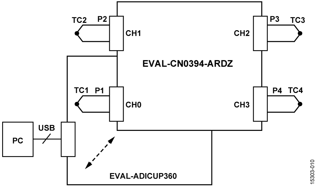 この回路では、EVAL-CN0394-ARDZ Arduino シールド・ボードと EVAL-ADICUP360 Arduino プラットフォーム・ボードを使用しています。2 枚のボードは、EVAL-CN0394-ARDZ を上に、EVAL-ADICUP360 を下にして容易に積み重ねることができます。EVAL-CN0394-ARDZ ボードのソケット P1 ~ P4 に熱電対を接続します。