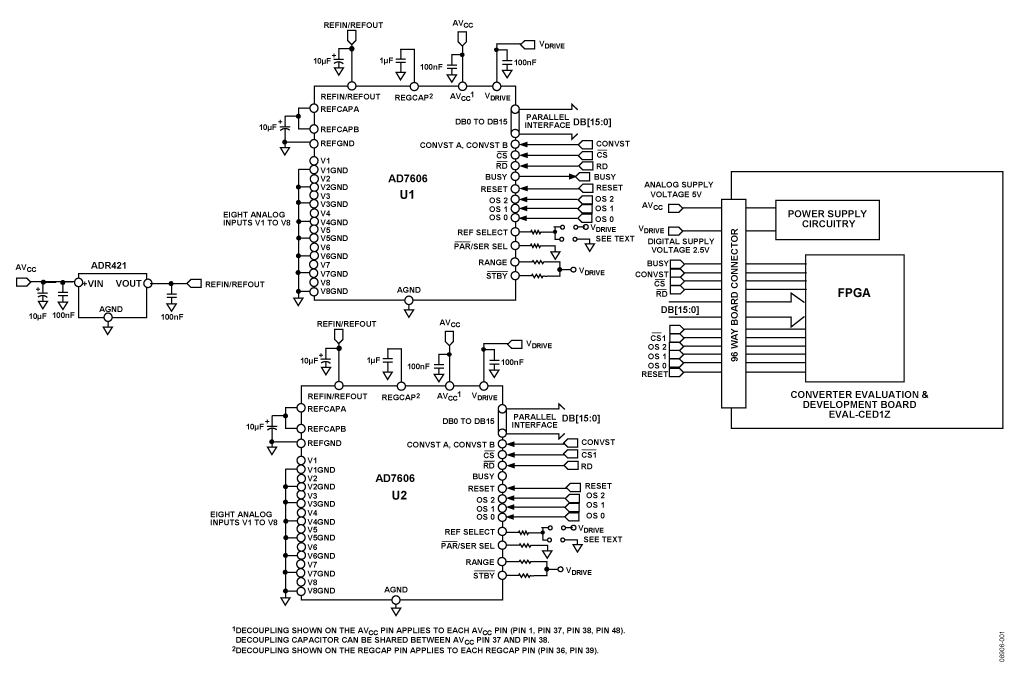 This circuit note describes details of the recommended PC board layout for applications using multiple AD7606 devices. The layout is optimized for channel-to-channel matching and part-to-part matching and will help reduce the complexity of calibration routines in high channel count systems. The circuit provides the ability to use the AD7606 2.5 V internal reference when channel-to-channel matching is important or an external ADR421 precision high accuracy (B grade: ±1 mV max), low drift (B grade: 3 ppm/°C max), low noise (1.75 μV p-p, typical, 0.1 Hz to 10 Hz) reference for high channel applications that require excellent absolute accuracy. The low noise and the stability and accuracy characteristics of the ADR421 make it ideal for high precision conversion applications. The combination of the two devices yields a level of integration, channel density, and accuracy that is unsurpassed in the industry.