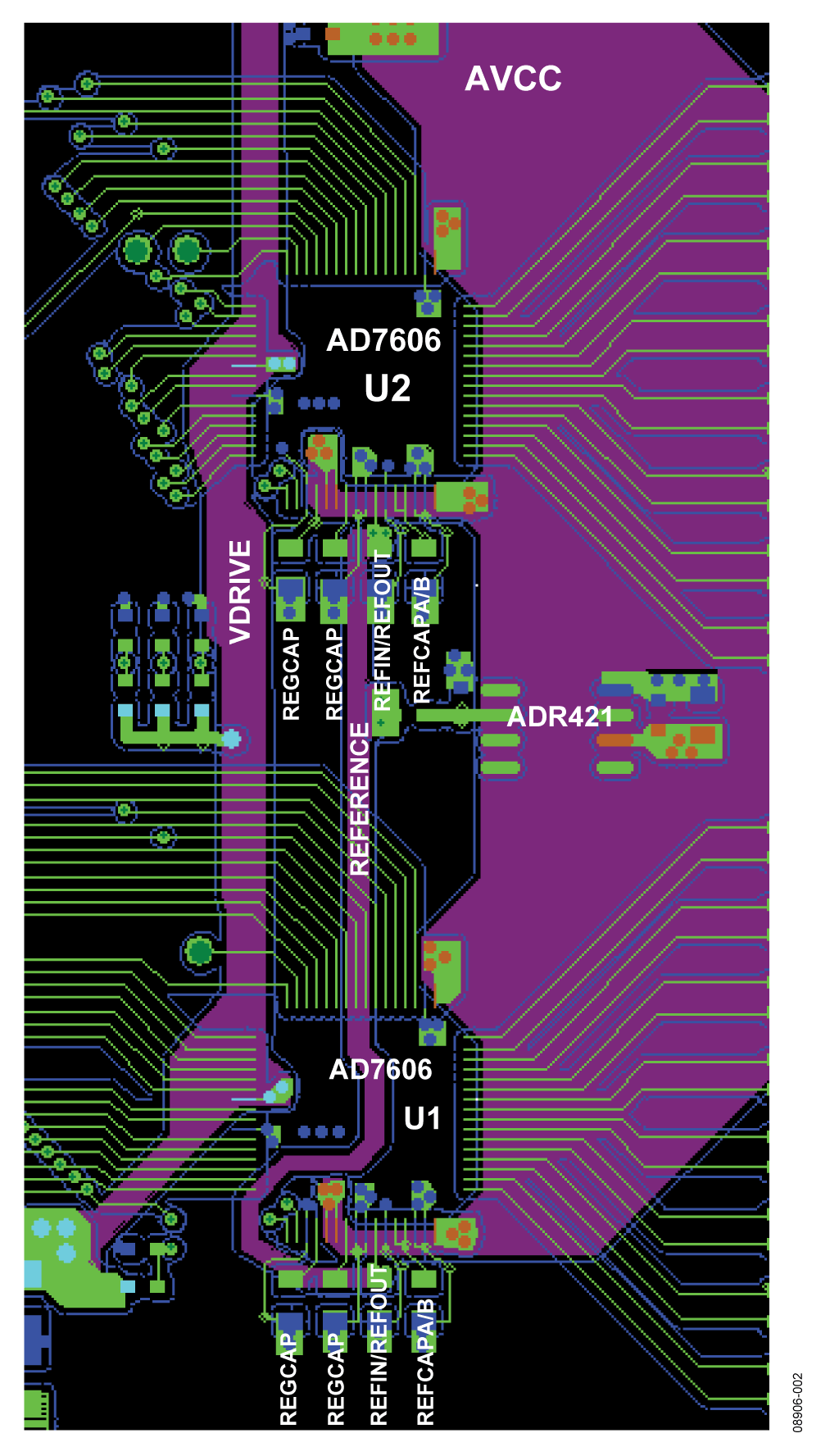 The AVCC supply plane runs to the right of both devices. The VDRIVE supply track runs to the left of the two AD7606 devices. The ADR421 reference chip is positioned between both AD7606 devices, and the reference voltage track runs upward to Pin 42 of U2 and downward to Pin 42 of U1. A solid ground plane is used. These symmetrical layout principles can be applied to a system that contains more than two AD7606 devices. The AD7606 devices can be placed in a north-south direction with the reference voltage located midway between the AD7606 devices and the reference track running in the north-south direction, similar to Figure 2.