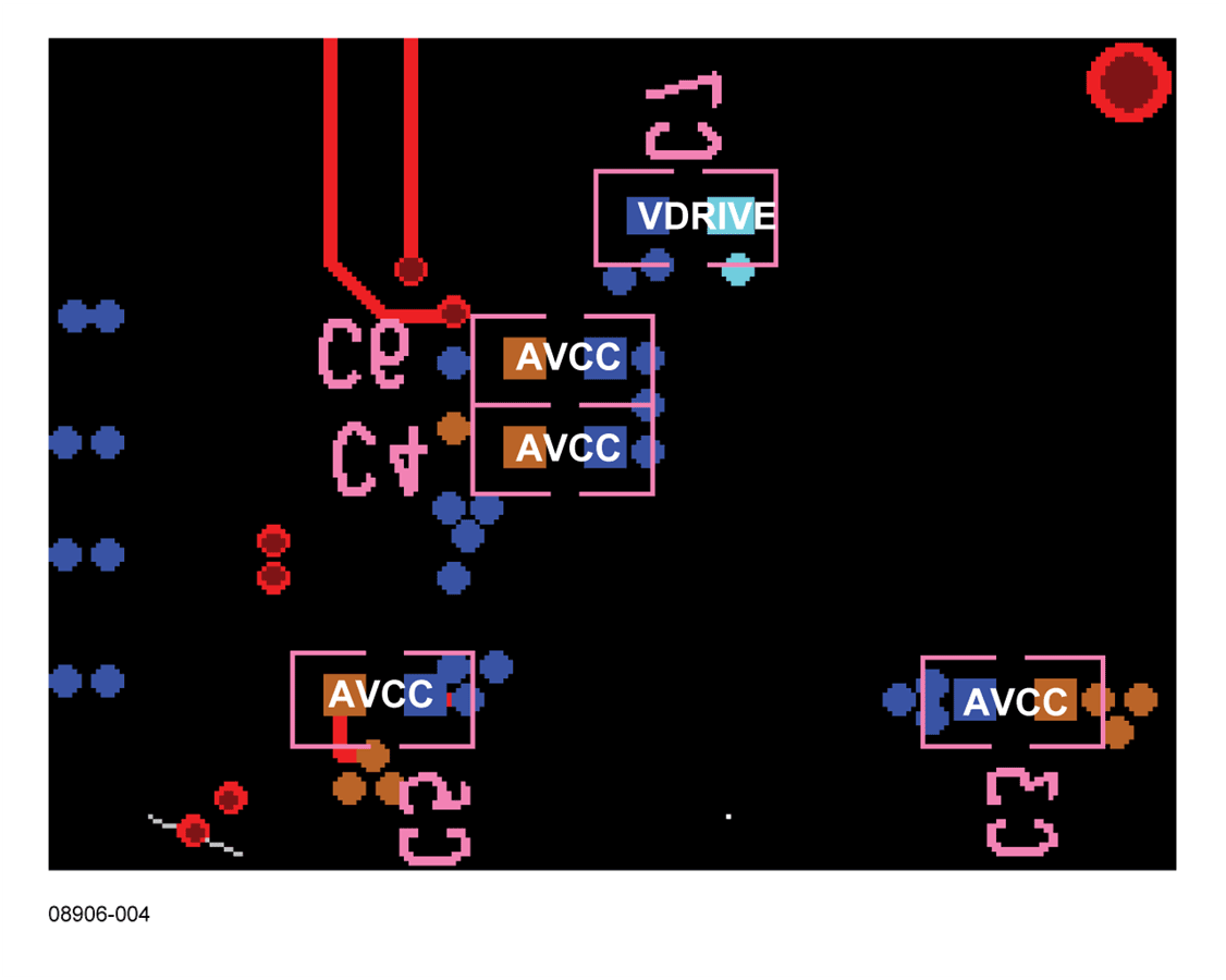 Figure 4 shows bottom layer decoupling. Bottom layer decoupling is for the four AVCC pins and the VDRIVE pin. Multiple vias are used to connect the pins to their respective decoupling capacitors. Symmetrical layout of the decoupling capacitors around the AD7606 devices will help with part-to-part performance matching. Multiple vias are used to connect capacitor pads and pin pads to ground and supply planes and the reference track.