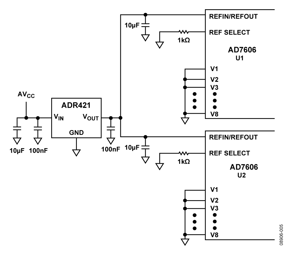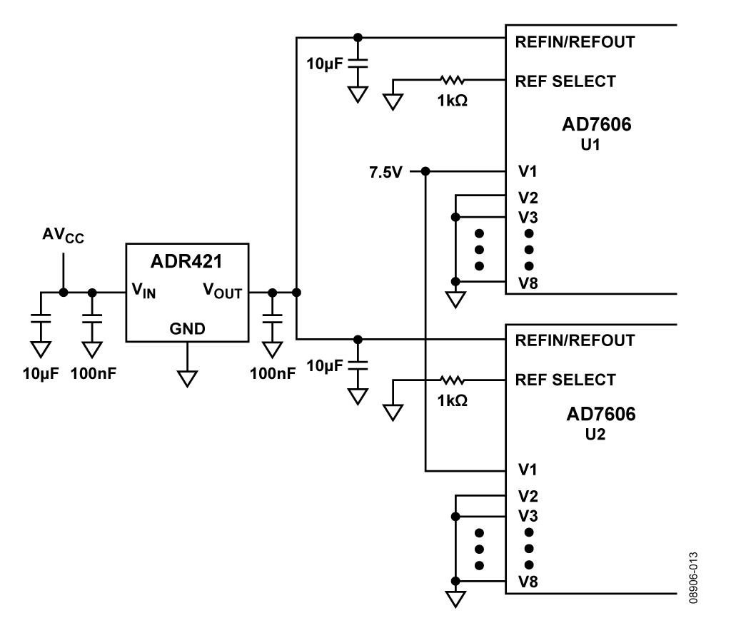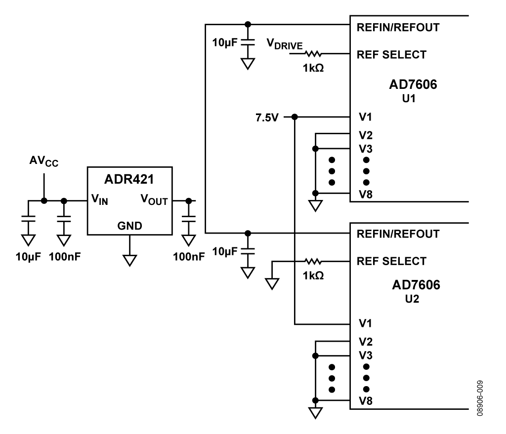 The AD7606 has an internal 2.5 V reference that is internally amplified to provide the AD7606 ADC with an approximate 4.5 V buffered reference. In high channel count applications where channel-to-channel and part-to-part matching performance is critical, the internal reference of one AD7606 can be used to provide the reference to the second AD7606 device. For this configuration, U1 is configured to operate with the internal reference enabled, as shown in Figure 7.
