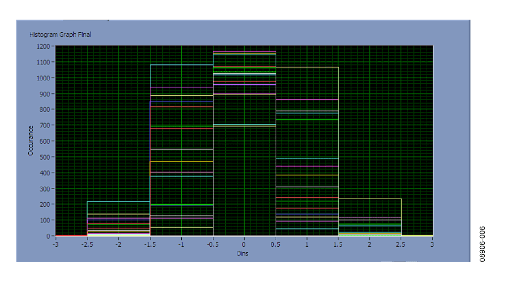 The histograms indicate that, with the ADR421 external system reference, the matching between the mean of the histograms on one AD7606 device and between multiple AD7606 devices is less than 1 LSB.