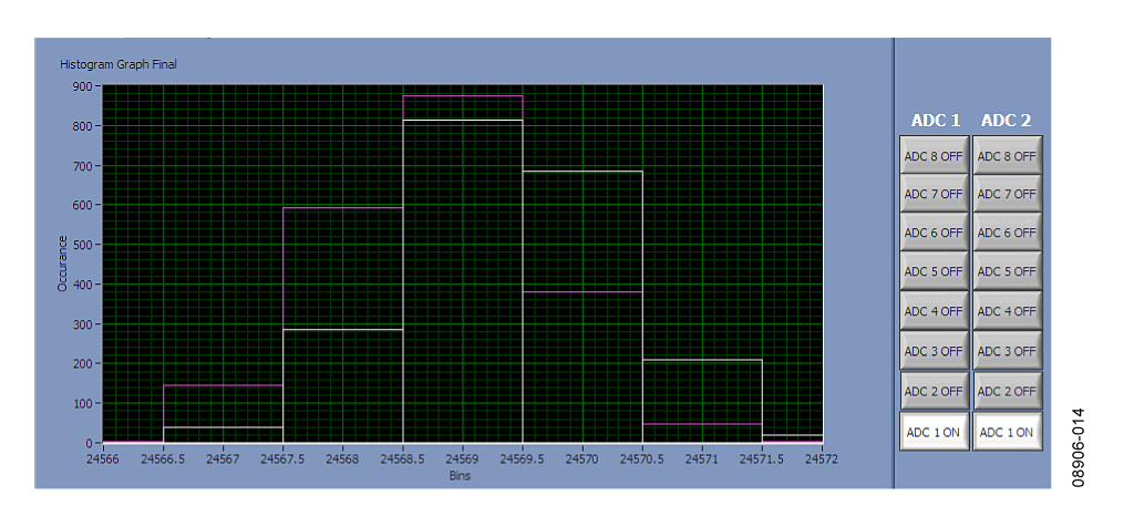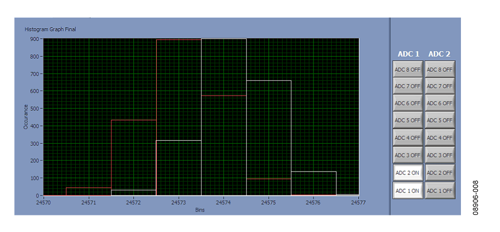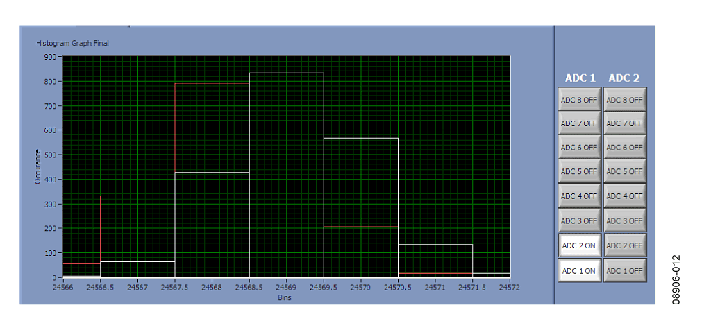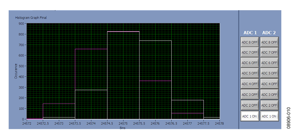 A dc voltage of 7.5 V is applied to the input of U1 (V1 and V2), shown in the circuit of Figure 11, using the external reference. The histogram of codes of the two channels on U1 is recorded in Figure 12. The difference in the mean of the histogram of codes for both channels is 0.9 LSB.