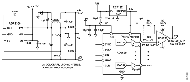 回路は公称12Vの単電源電圧(10 V ~ 15 Vの間変動する可能があります)で動作します。反転昇降圧回路構成のスイッチング・レギュレータADP2300から安定化された-5 V電源電圧が生成されます。回路はADIsimPowerを使って設計できます。非レギュレーション5V電源を生成するためにジータ構成の回路に結合インダクタL1を使用します。この回路は小出力電流の場合高効率です。
