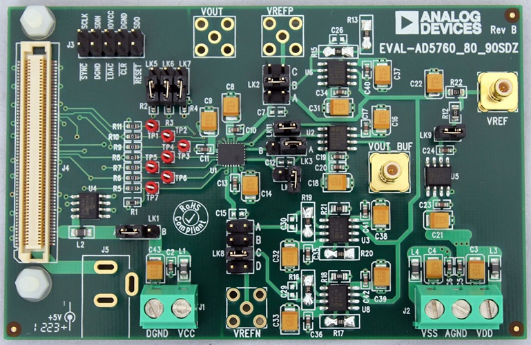 - AD5780のデジタル電源用にコネクタJ1のVCCとDGND間に3.3 V。あるいは、ポジションAにLink 1を配置してSDPボード経由でUSBからデジタル回路に電源を供給する(デフォルト設定)。