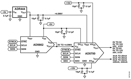 図 1の回路は、プログラマブル・ロジック・コントローラ(PLC)/分散制御システム(DCS)アプリケーションの大部分の条件を満たす全機能型の柔軟なプログラマブル・アナログ出力ソリューションです。低消費電力(0.75 mW @ 5 V)、レールtoレール出力、16ビットnanoDAC®コンバータAD5662と産業用電流/電圧出力ドライバAD5750は、入力/出力電圧範囲やリファレンス電圧条件の面で互いに極めて相性のよいデバイスです。ADR444は低ドリフト(Bグレード:最大3 ppm/℃)、高初期精度(Bグレード:最大0.04%)、低ノイズ(1.8 μV p-p (typ)、0.1~10 Hz)といった特性を備えており、AD5750とAD5662の両方のリファレンス電圧となり、回路の超低ノイズ、高精度、低温度ドリフトを保証します。この回路はすべての代表的な電圧/電流出力範囲に対応しており、16ビット分解能、ノー・ミッシング・コード、0.05%の直線性、0.2%未満の総合出力誤差を実現します。