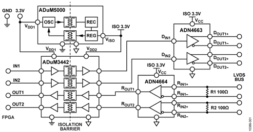 • LVDSドライバ/レシーバ間のロジック信号を絶縁して、回路のバス側における標準LVDS通信を保証。