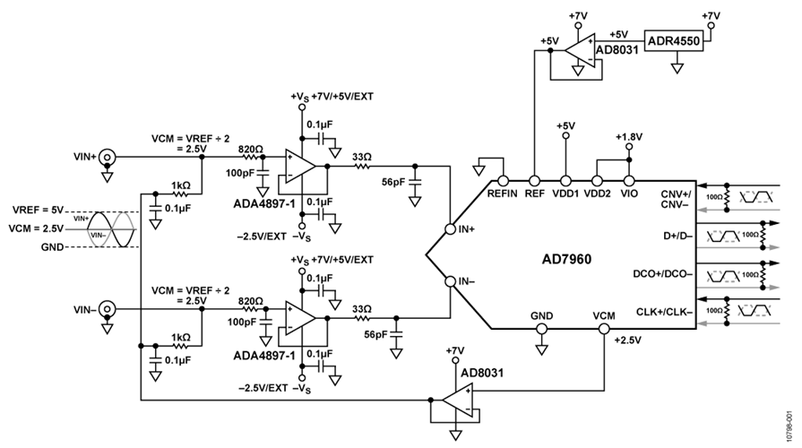 AD7960 ADCの評価とテストのためにEVAL-AD7960FMCZ評価ボードが開発されました。図1の回路をテストするために、2個のADA4897-1オペアンプを使ってAD7960を駆動しています。