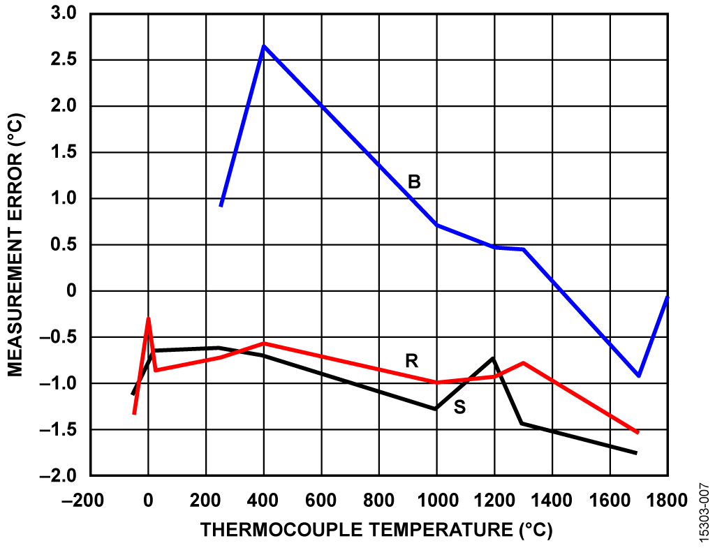 E、J、K、N、T のタイプの熱電対に対する温度のシミュレーション結果と測定結果の誤差を図 6 に、B、R、S の熱電対に対する誤差を図 7 に示します。測定の前に、ADuCM360 の ADC でゼロスケールとフルスケールの補正をしています。