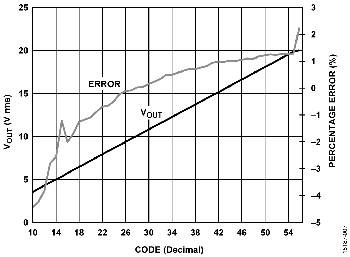 図 6 は、無負荷でコード 56 を超えた点から出力電圧が制限されていることを示しています。この点で、コンパレータ入力が入力のコモンモード電圧の上限に近づきます。