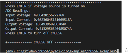 - The input and output voltage and current at the V1 and V2 will be printed in the terminal. The board will continuously regulate the output voltage to 14 V unless CN0556 is turned off.