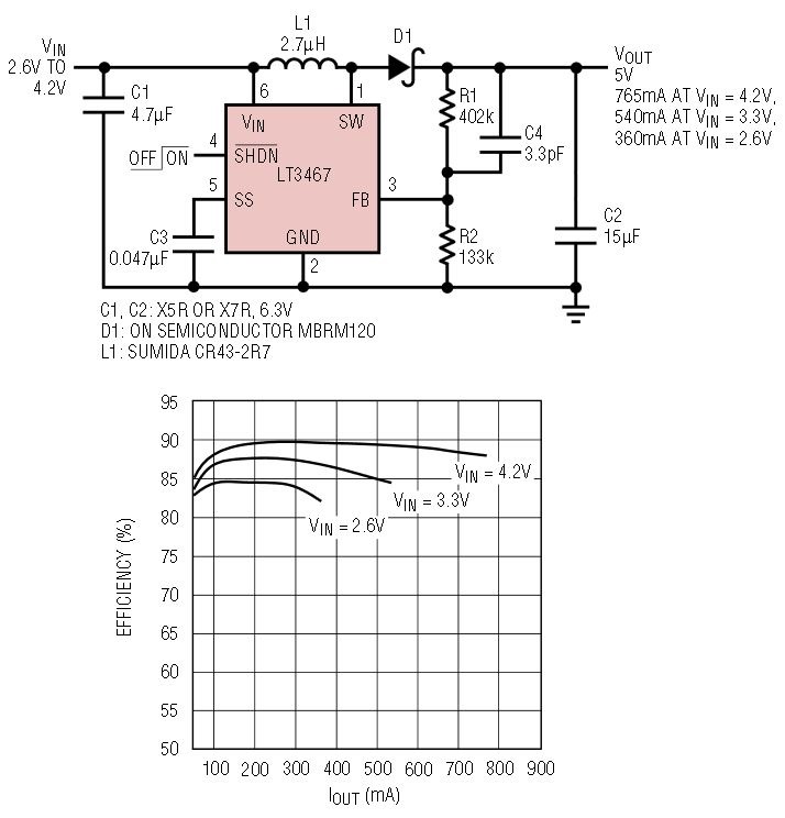 Figure 1. Single Li-Ion cell to 5V boost converter and its efficiency.