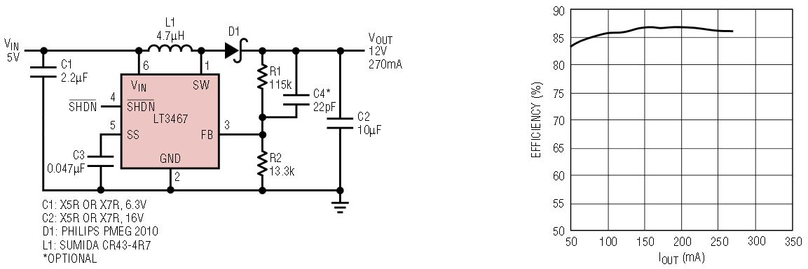 The LT3467 can be used in many different applications where voltage conversion is necessary. For example, in a boost topology, any voltage up to 40V can be produced from a lower voltage assuming the duty cycle of the application is within the ability of the part (see the data sheet for more information). Figure 4 shows a 5V to 12V application capable of up to 270mA. The efficiency peaks at 87%.