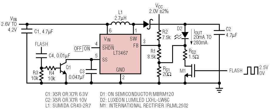 Figure 5 shows an application powering a Lumiled from a Li-Ion supply. In this application, the output is the current through the LED, which can vary from 20mA for a “flashlight mode” when the Flash signal is low, up to 280mA when the Flash signal is high (at 2.5V). This is useful, for example, when a small amount of light is normally required, but where a brief burst of bright light is occasionally useful, such as in a camera flash for a cell phone. An extra supply, VCC = 2.0V ±2% is required to reduce the power dissipated in the sense resistor string. Instead of placing the sense resistor directly on the feedback pin, which will servo to 1.255V and dissipate 1.255V • IOUT(MAX), we use an extra 100μA to level shift the sense resistor voltage. By selecting R1 = 8.5kΩ, we reduce the voltage by 0.85V, thus reducing the power wasted in the sense resistor chain to 0.405V • IOUT(MAX), less than a third of the original power dissipated in this resistor.