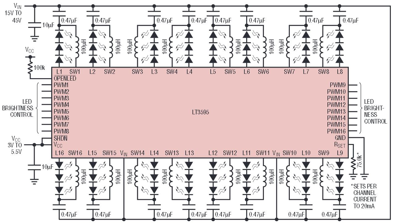 Figure 1. A 16-channel LED driver. The 15V–45V input is used to drive three white LEDs per channel with 5000:1 PWM dimming.