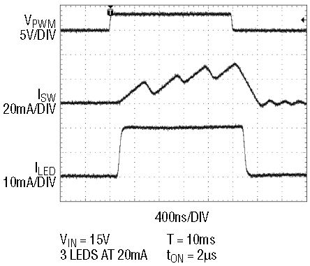 The PWM dimming capability of the LT3595 is as high as 5000:1. Figure 2 shows the 5000:1 PWM dimming waveform and a very square looking LED current waveform. Even at a mere 2μs on-time, a 20mA LED current snaps up and turns off in sync with the 100Hz PWM signal. Higher PWM dimming ratios are achievable with lower PWM frequencies, but 100Hz guarantees that there is no visible flicker.