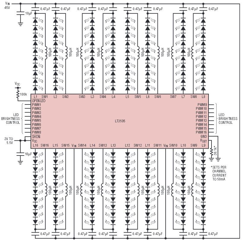 The LT3595 is a 16-channel buck mode LED driver with 5000:1 PWM dimming. The high 45V input voltage, 50mA LED current, and 2MHz switching frequency make this a very powerful multichannel LED driver for big screen televisions, billboards and stadium displays. The fully integrated solution in the compact 5mm × 9mm QFN package makes the designs small and simple. 5000:1 PWM dimming is one of the highest PWM dimming capabilities available in an integrated DC/DC converter LED driver IC. The inductors, the input and output capacitors, the set resistor and the LEDs are the only required external circuitry. The 16 independently controlled channels maximize the flexibility of the LT3595.