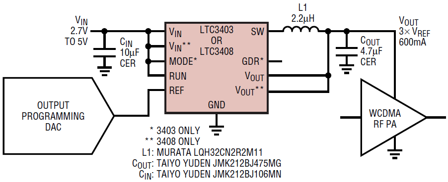 The LTC3403 and the LTC3408 are high performance monolithic, synchronous step-down DC/DC converters well suited for applications requiring up to 600mA of output current while dynamically adjusting output voltage from 0.3V–3.5V to prolong battery life. Their internal low RDS(ON) power switches and bypass switches, their high switching frequency, and the small number of ancillary components allow these regulators to offer compact, high efficiency power supply solutions for WCDMA power amplifiers.