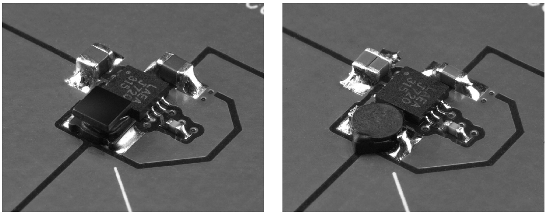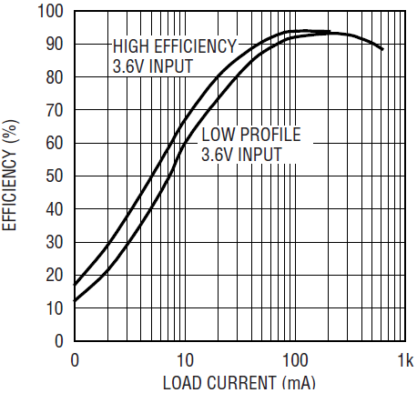 Figure 2 shows the same circuit, next to a version modified to include components with a maximum height of 1.1 mm1. The inductor is shielded, but occupies a larger footprint. Switching losses in the inductor cause nearly a 10% drop in efficiency at low currents (Figure 3). At higher currents, DC resistance predominates, allowing the low profile inductor to match the efficiency of the unshielded inductor.