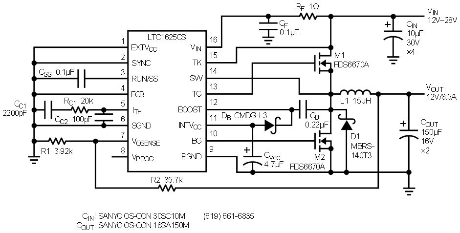 The circuit shown in Figure 1 is a power converter that produces a 12V output at up to 8.5A from an input that can range between 12V and 28V. The 100W of output power is converted at 97% efficiency with only 3W dissipated on the board. No special heat sinks were used other than a widened VIN trace connected to the drain of M1. This point reached a maximum temperature of 75°C in a 25°C environment. L1 is a custom-wound inductor using fourteen turns of 15 gauge wire on a Magnetics, Inc. Kool Mµ® 77206-A7 core. The entire converter takes up a volume of only 0.65in3 and processes an impressive 150W per cubic inch.