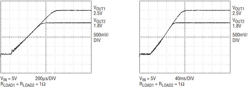 Figure 5. Startup waveforms showing soft-start and tracking (internal 1ms soft-start on the left and external 150ms soft-start on the right).