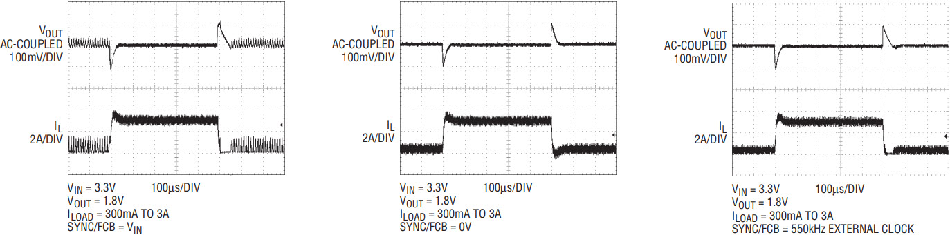 Figure 6. Transient response to a 300mA to 3A load step (left to right, Burst Mode operation, forced continuous, and pulse skipping mode).