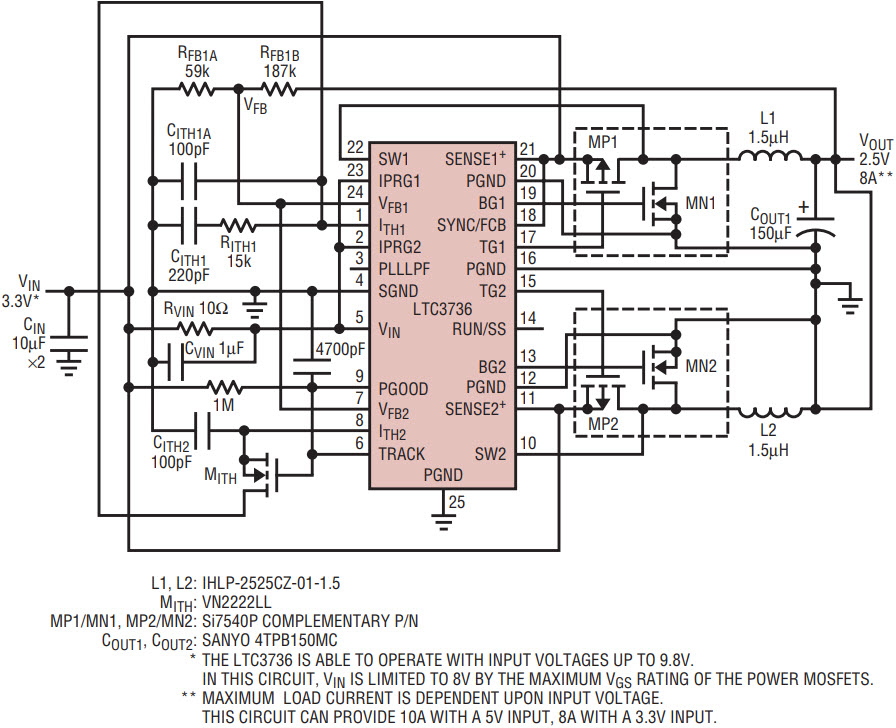 Figure 1 shows a typical application for the LTC3736. This circuit provides two regulated outputs of 2.5V and 1.8V from a typical input voltage of 5V, but it can also be powered from any input voltage between 2.75V and 9.8V (depending on the voltage rating of the power MOSFETs). This wide input range makes the LTC3736 suitable for a variety of input supplies, including 1- and 2-cell Li-Ion and 9V batteries, as well as 3.3V and 5V supply rails.