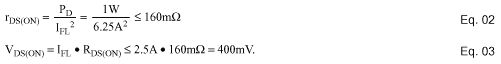 - Select Q1 to have insignificant full-load voltage drop VDS(ON) and/or an acceptable and sustainable power loss PD. Voltage drop appears across the drain-to-source resistance of Q1 plus an additional drop across the connector and circuit trace resistances. Assume that the circuit traces are appropriately sized for minimum drop, and consider Q1's ID(ON), rDS(ON), and PD. ID(ON) must certainly be greater than full-load current IFL, but that requirement will be easily met when rDS(ON) is selected. In this example a PD = 1W is selected as reasonable. Then