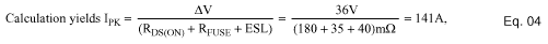 ≈ 50A as before. The short circuit places the entire supply voltage across the MOSFET in series with the fuse resistance. Neglecting the fuse resistance provides a worst-case calculation of